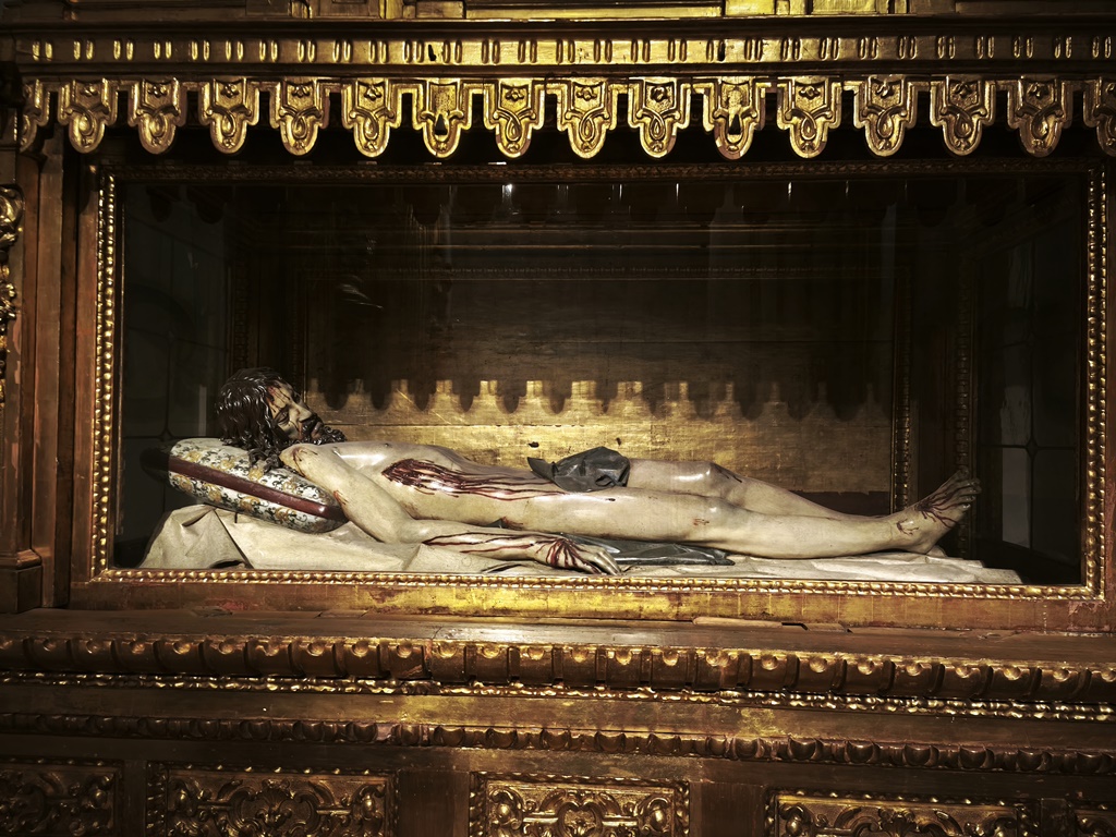 Otra historia truculente ronda entre las paredes del convento. Se sabe que Jerónimo de Villanueva residía en una casa frente a San Plácido, en la que se había construido un pasadizo que comunicaba casa y cenobio. En esta casa se reunía el bueno de don Jerónimo con los prebostes del momento, incluido Felipe IV y el conde duque de Olivares. El rey, a quien se atribuyen una treintena de hijos extramatrimoniales, además de los diez habidos en el primer matrimonio y los seis nacidos en el segundo, era un tipo rijoso sin que distinguiera entre laico y sagrado. Así, parece que se enamoró de sor Margarita, una monja joven, que rechazaba sistemáticamente las pretensiones reales. Tanta era la insistencia del rey que las monjas tuvieron que fingir la muerte de la religiosa. Una segunda versión sobre la presencia del Cristo de Velázquez en el convento atribuye el encargo al mismo rey, para hacerse perdonar sus excesos. Allí estuvo, en todo caso, hasta que el valido Godoy se lo llevó a su palacio. Tiempo después fue recuperado y actualmente puede contemplarse en las salas del Museo del Prado dedicadas al pintor sevillano 👇. Una copia de este lienzo cuelga en el coro bajo de la iglesia.
