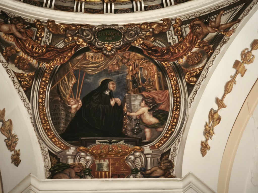 En 1668 llega Francisco Rizzi, autor de los frescos de la cúpula, distribuida en ocho sectores, con las cruces de las órdenes militares y adornos de motivos vegetales y pequeños ángeles. En las pechinas representó a cuatro santas benedictinas: Hildegarda, Isabel de Schonangia, Francisca Romana y Juliana de Mont-Cornillón.