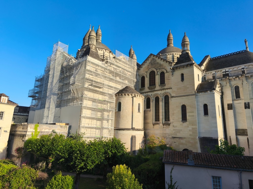 Como siempre, hemos reservado hotel céntrico y con aparcamiento. Nuestra primera y grata sorpresa es que la ventana de nuestra habitación se asoma a la cabecera de Saint-Front. Que la iglesia esté medio cubierta por obras no merma la emoción de la cercanía.