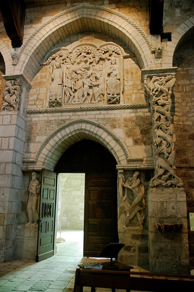 Pero lo que atrae la atención de esta iglesia es su portal, verdadero hito de la escultura románica. En el siglo XVI fue trasladado al interior del templo, donde ahora puede contemplarse. Sobre la puerta, un gran relieve está dedicado a San Teófilo el Penitente, que hizo un pacto con el diablo pero acabó arrepintiéndose, encomendándose a la Virgen y elevado a los altares. Flanquean la escena San Benito y San Pedro.