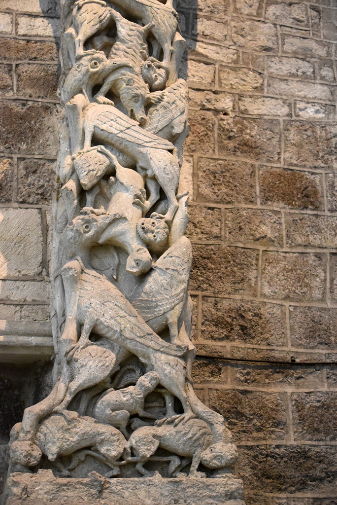 A la derecha del portal se ha adosado lo que fue columna del mainel original, una maraña de personajes y animales fantásticos, obra maestra escultórica.