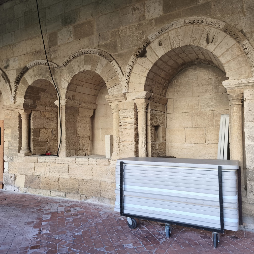 Acorde con los tiempos, el antiguo refectorio está ocupado hoy por la Oficina de Turismo. En una de las pandas del claustro descansas las mesas y sillas de un establecimiento cercano.