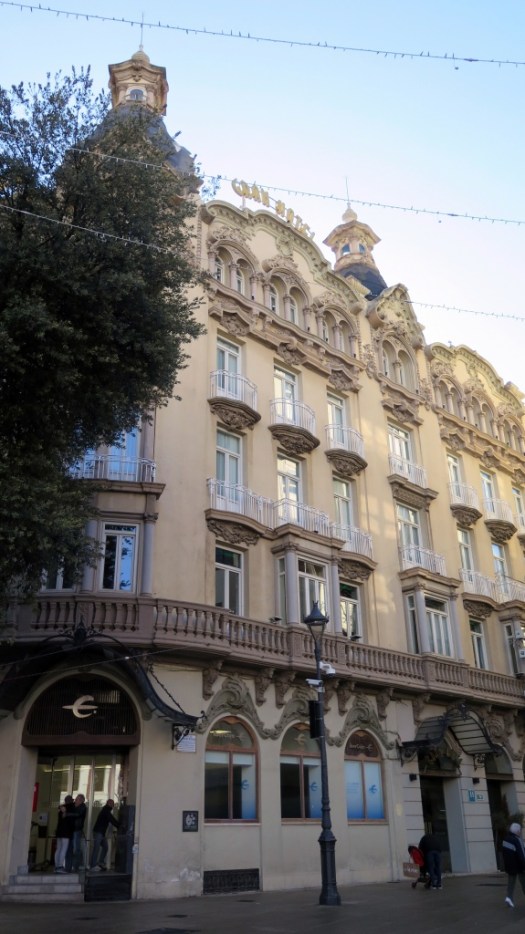 Bordeamos la muralla paseando hasta el hotel, donde descansamos un rato antes de seguir nuestra excursión cartagenera. Hemos echado en falta el submarino de Isaac Peral, que recordábamos en la Plaza de los Héroes de Cavite. Nos indican que ha sido trasladado al Paseo de Alfonso XIII, así que nos dirigimos allí. Subimos por la calle del Aire hasta Puertas de Murcia, atajamos por Santa Florentina, admirando los edificios modernistas👇 que encontramos al paso.