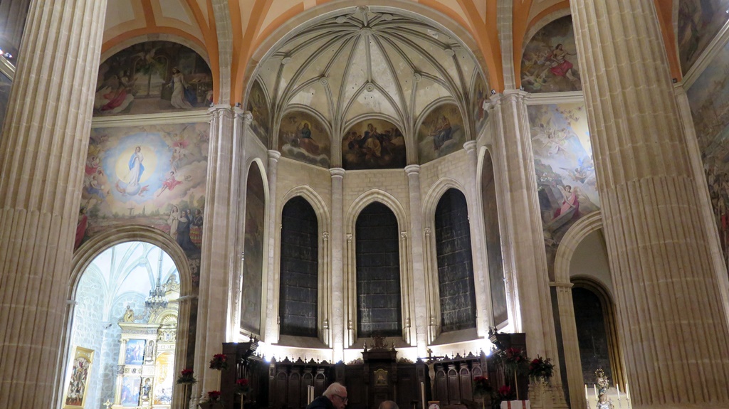 La capilla del evangelio ha estado dedicada a la Virgen desde siempre, pero actualmente guarda una arqueta con reliquias de los Santos Mártires, por lo que ha pasado a ser de Nuestra Señora de los Santos Mártires de Cardeña. Hay que observar detenidamente su bóveda, en cuyas nervaduras aparecen monstruos representantes del mal, y más detenidamente aún su clave, en la que aparece una imagen de la Virgen. Como los jubilados andamos regulinchi de la vista, nos percatamos de ello al abrir las fotos. Tenemos que volver a contemplarlo en directo, le propongo al Colega. Pues la próxima nos van a poner un plato en la mesa, me responde, porque hemos ido dos veces en una semana.